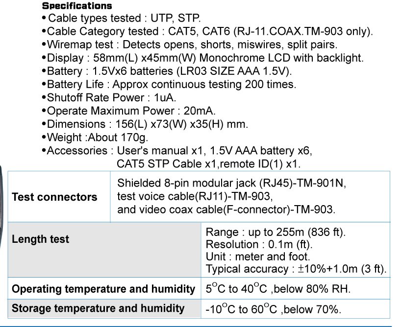 The TM-903 Multimedia Cable Tester is a hand-held test instrument that lets you verify and troubleshoot the LAN cable of twisted pair.
